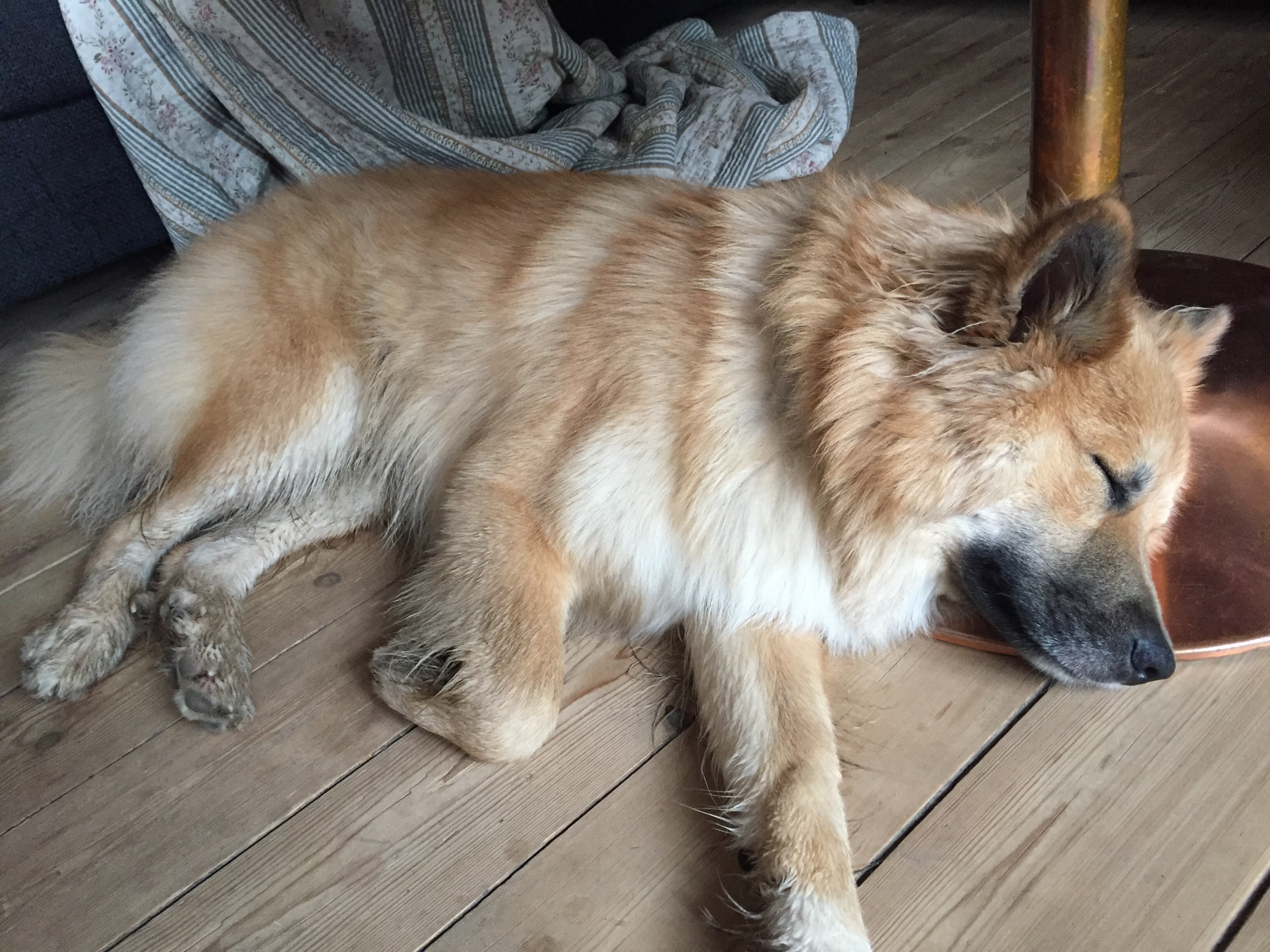 Natten er gået rigtig godt. Vi arbejder på at han ikke skal springe op i sengen – mest snasket er det når han lige har været ude i haven.
