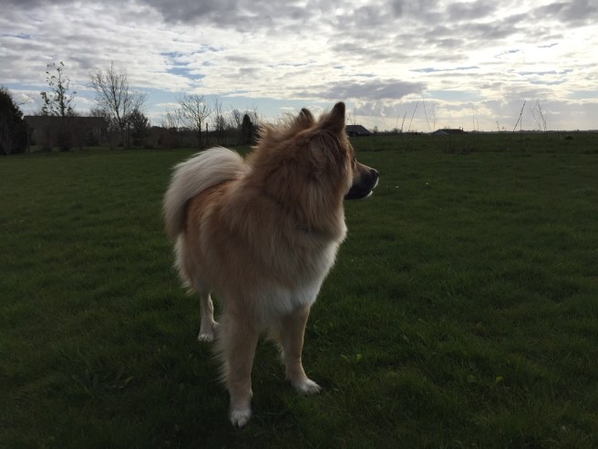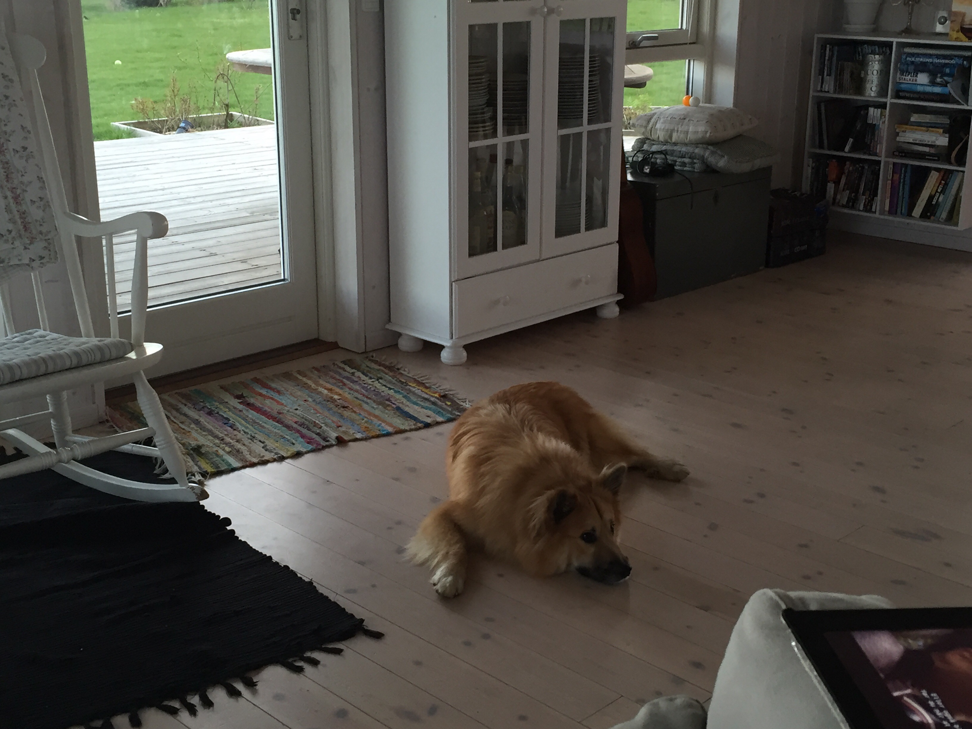 Han tonsede rundt om hytten, da vi ankom og vejrede igen og igen luften med snuden helt i sky. Jagtede svanerne i vandhullet på marken. Strakte ben hen over marken og vi kaldte ham pænt tilbage til vores grund.