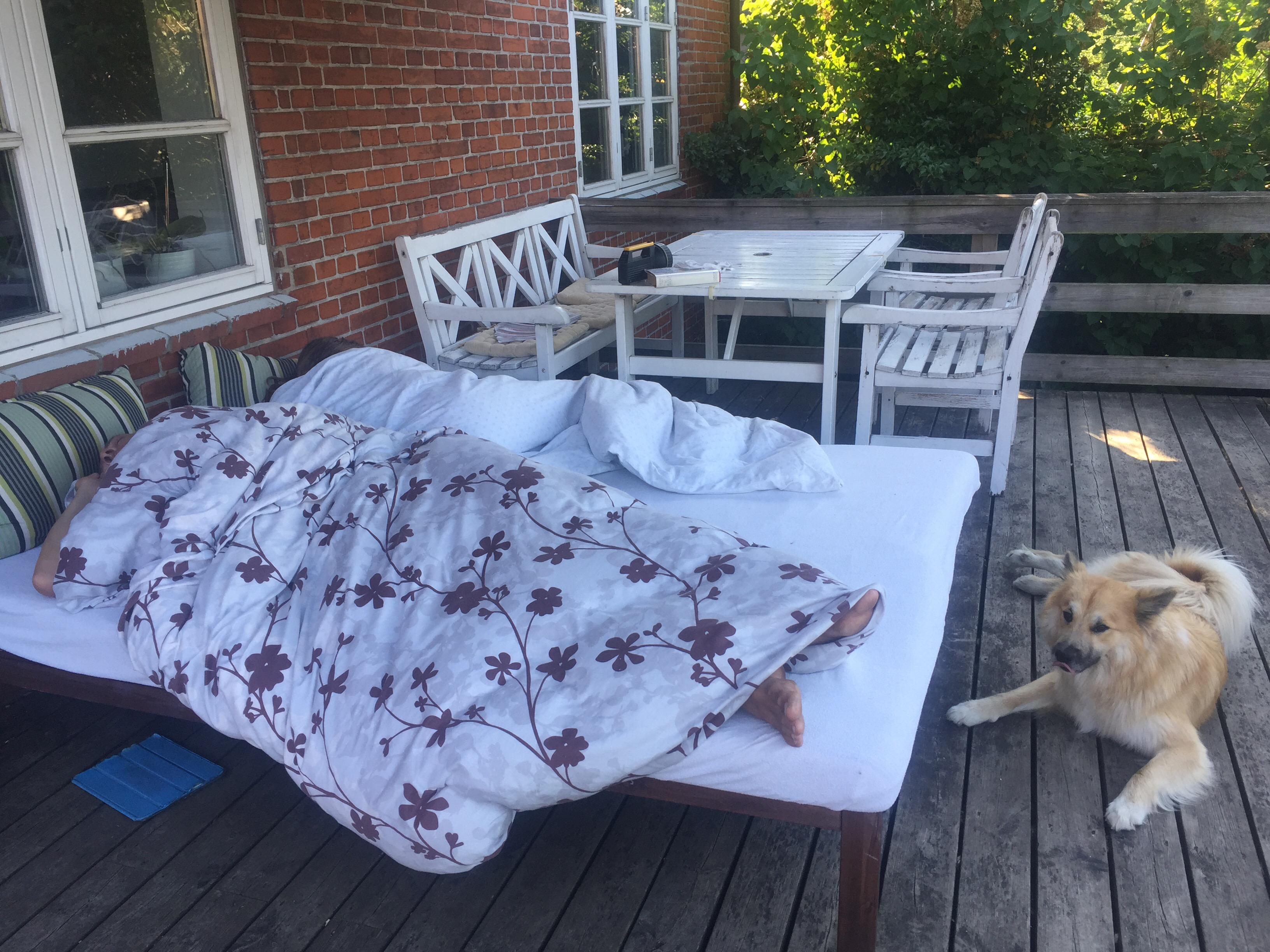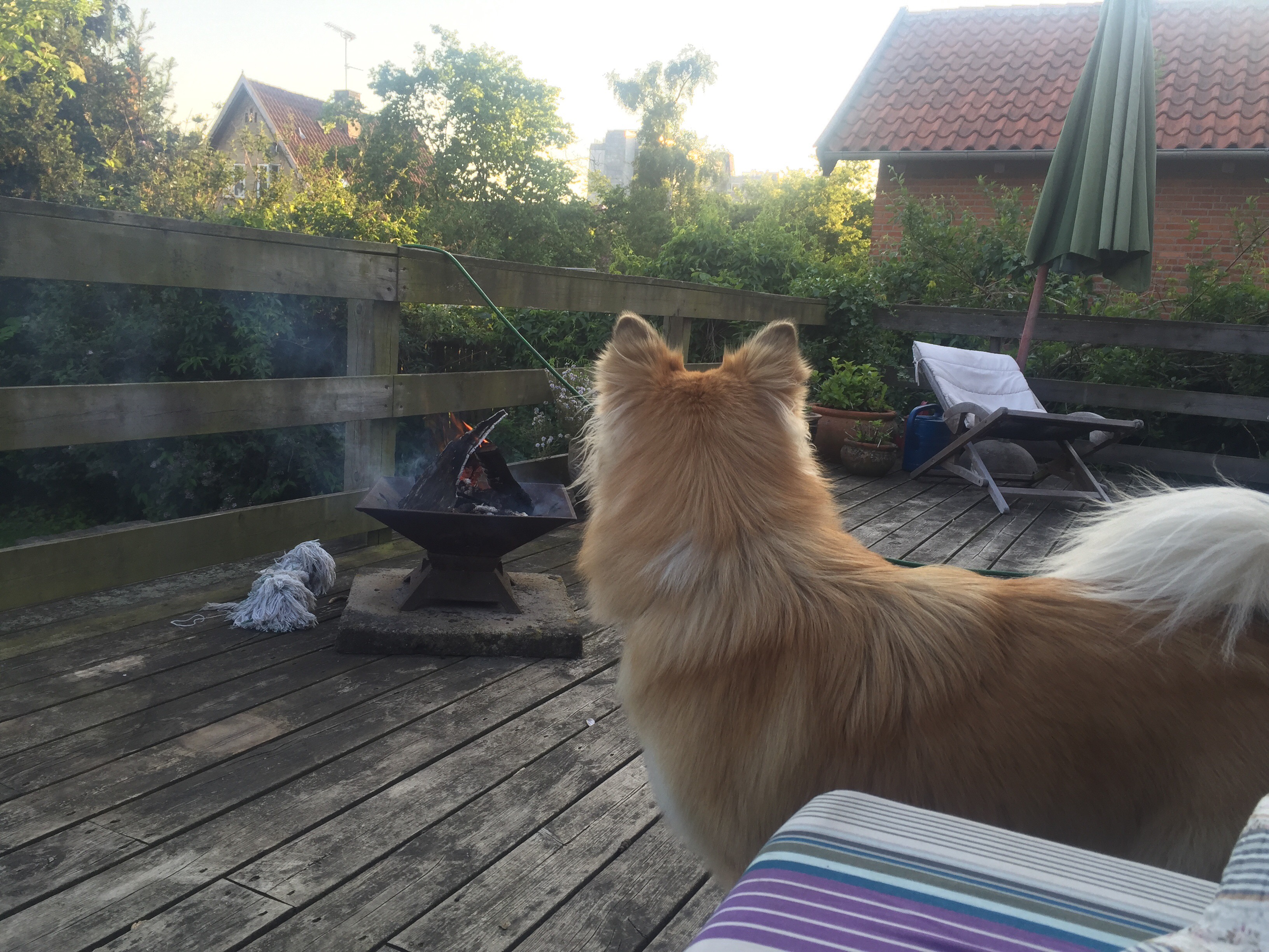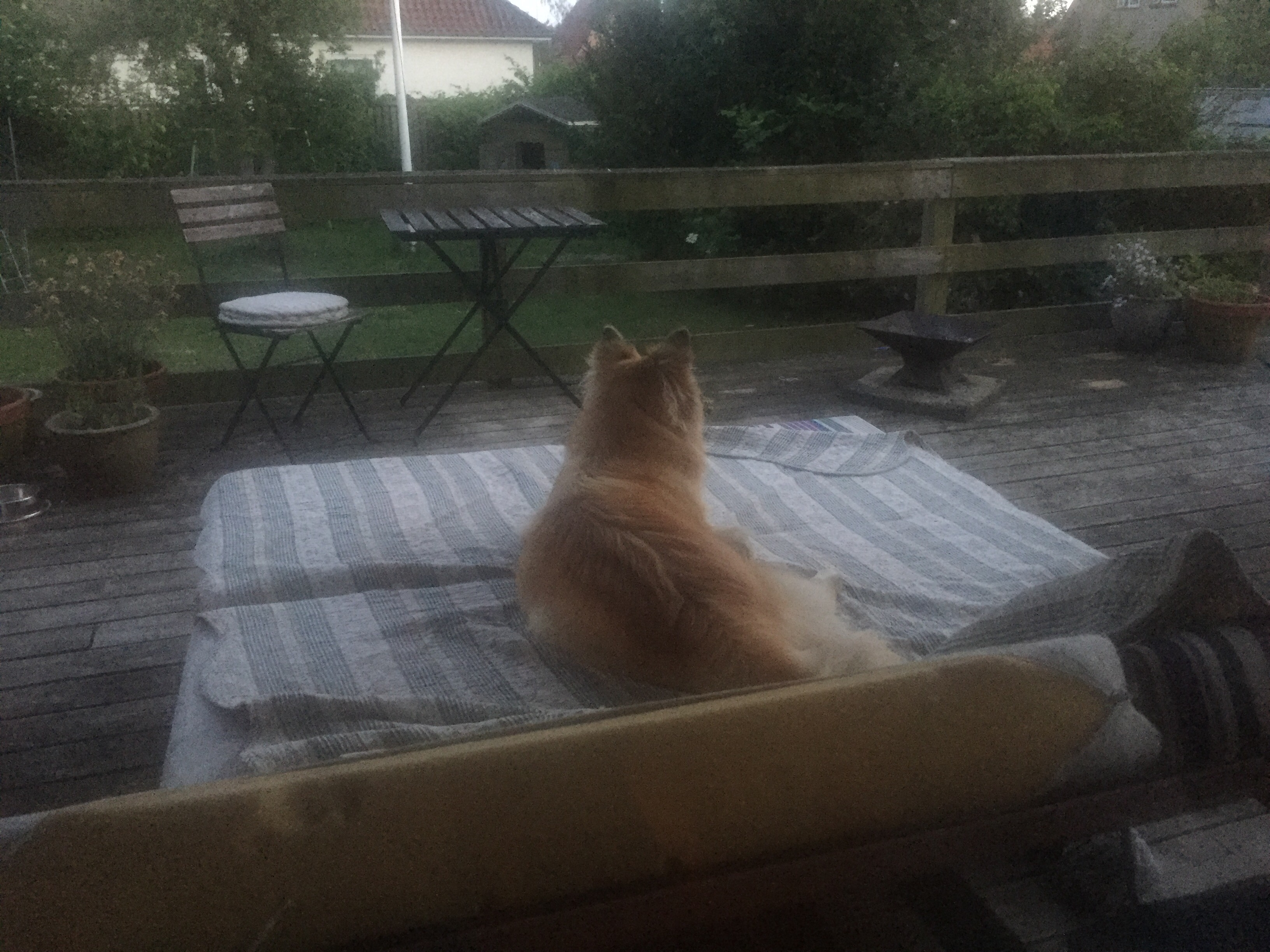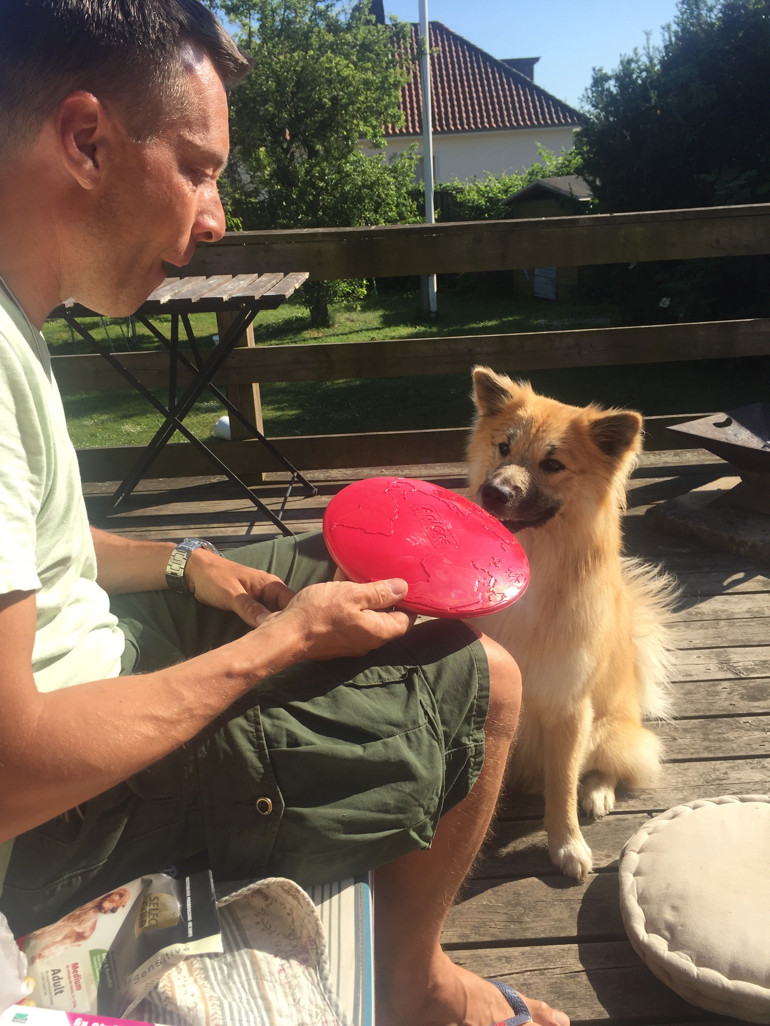 Disse dage er Balder ude non stop. Måske hviler han i skyggen i haven, måske leger vi sniger-frisbee. Den leg er sjov! For Balder gælder det om at lægge Frisbeen i nærheden af os UDEN at vi ser det, og derefter stille sig klar til at løbe efter den. I praksis kan han finde på at lægge den bag mine fødder i køkkenet og så spurte ud i haven for at stå klar hvis jeg kaster den.