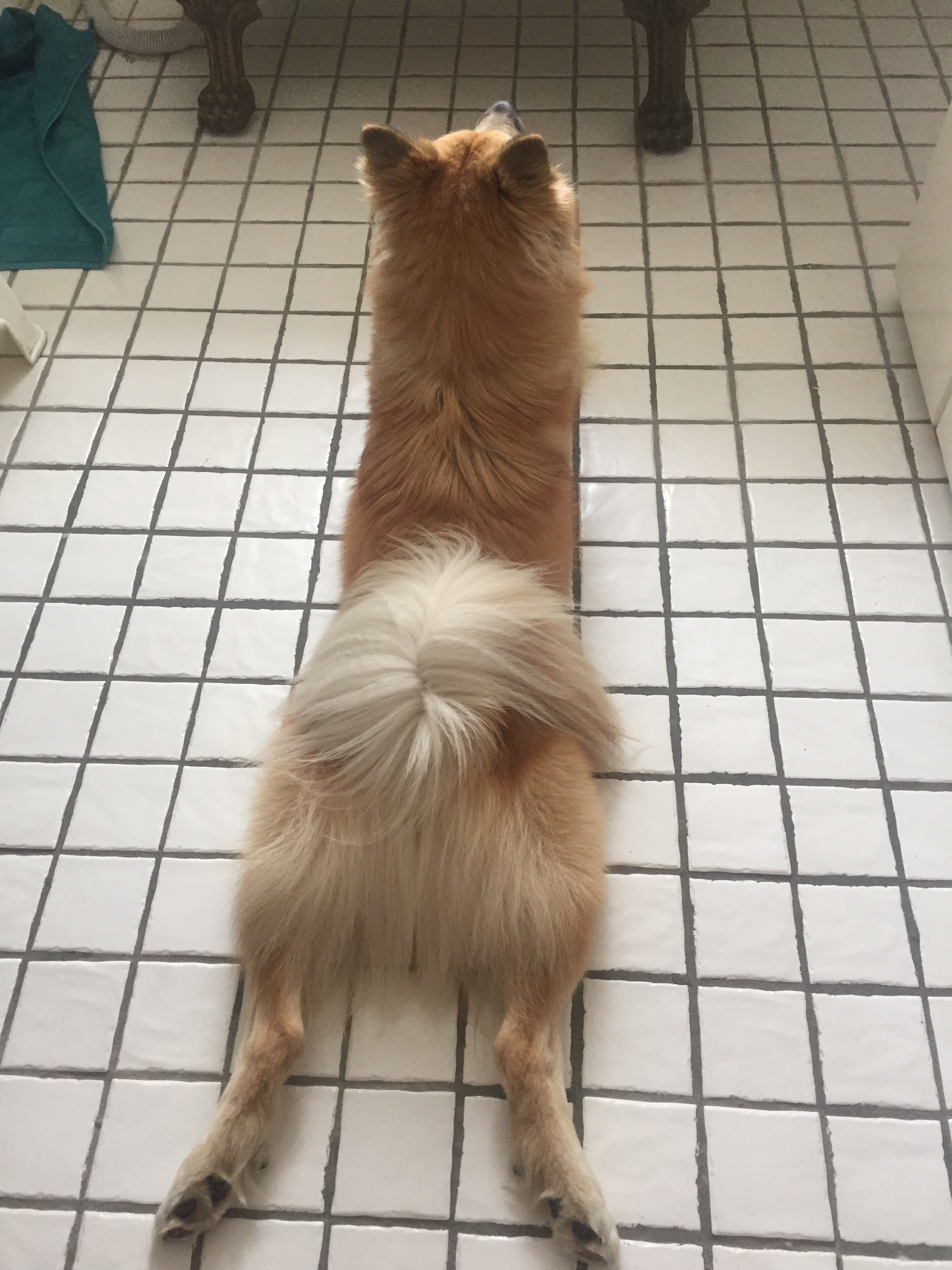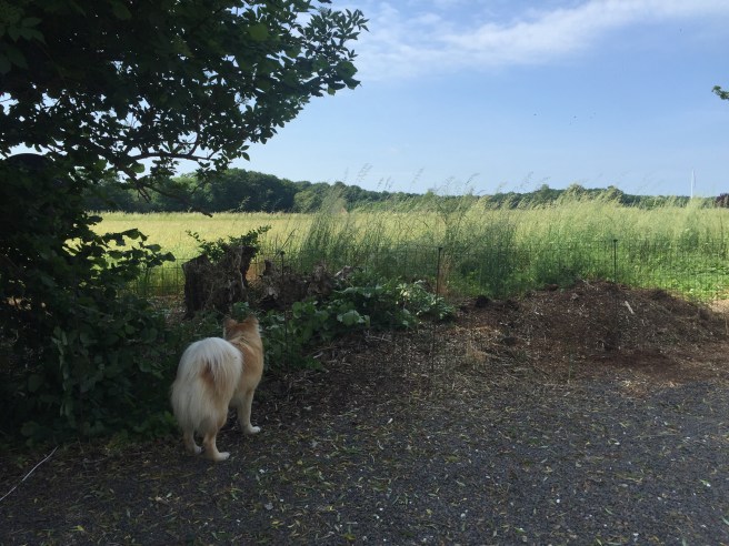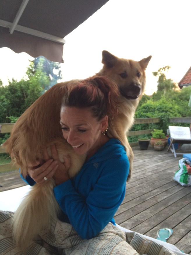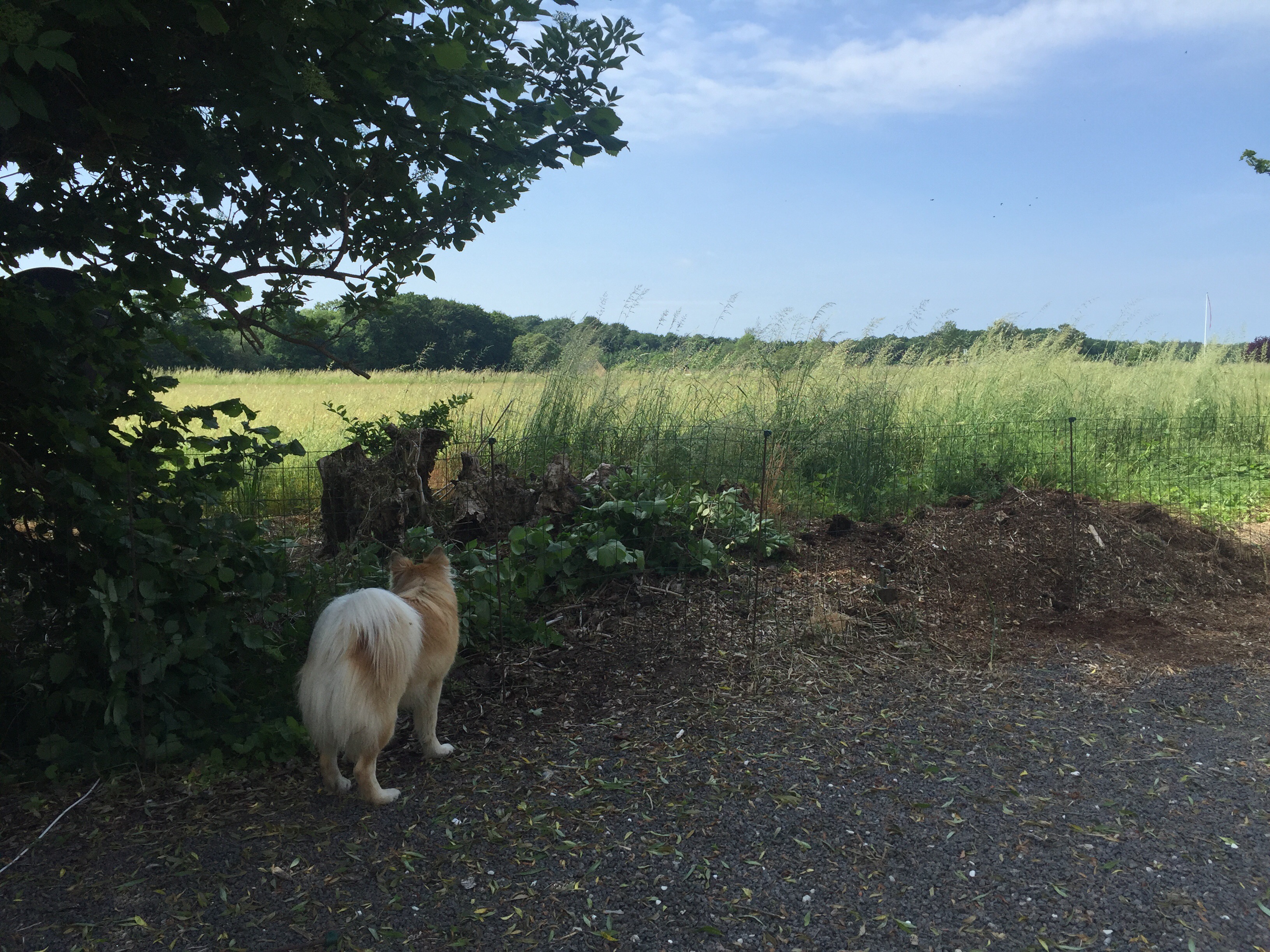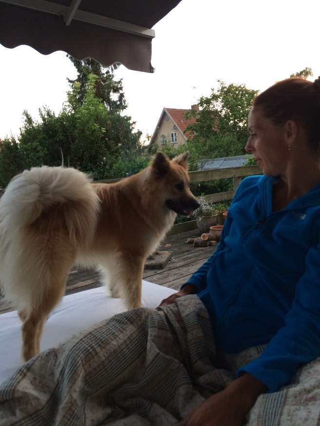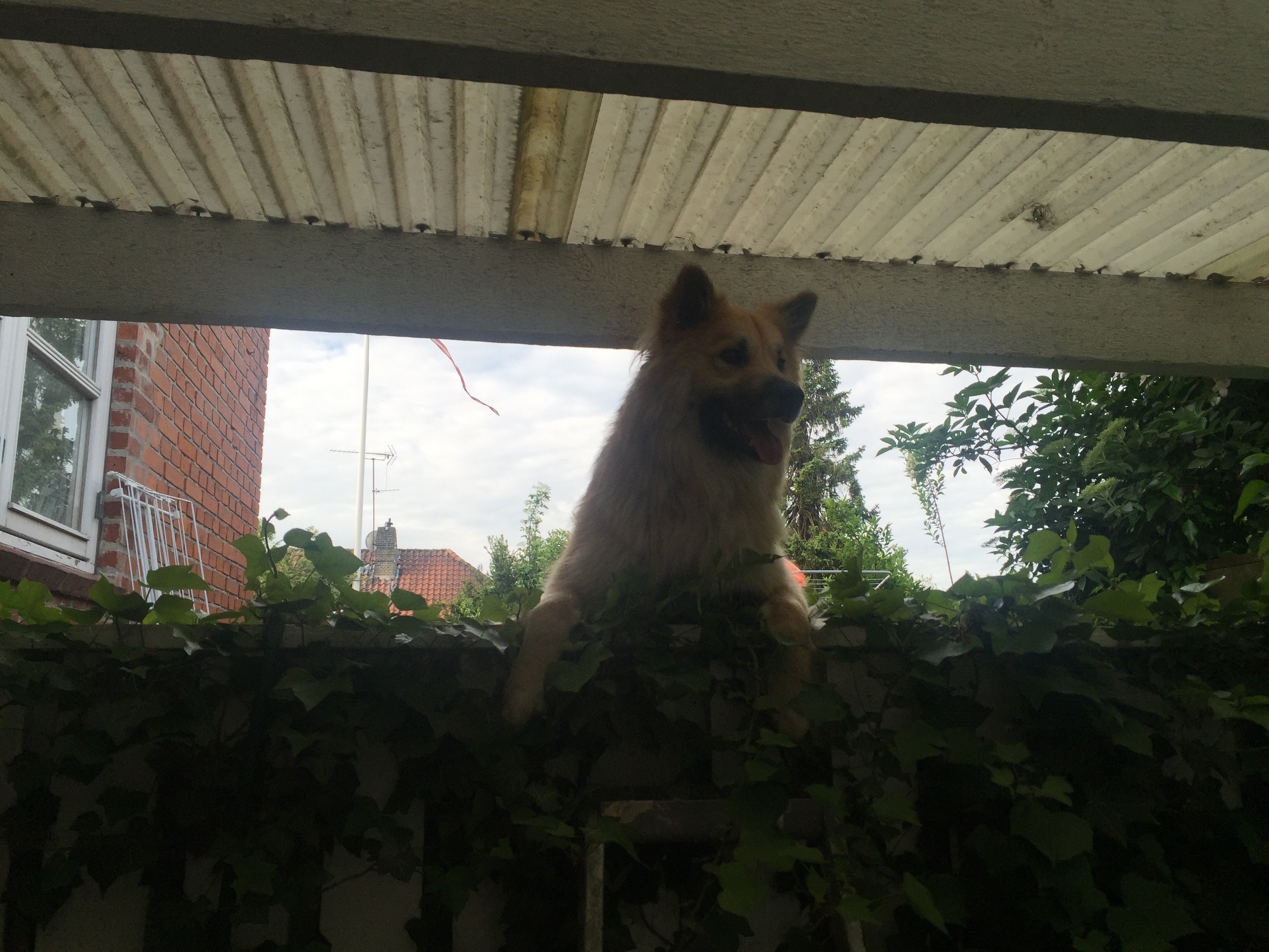 Disse dage er Balder ude non stop. Måske hviler han i skyggen i haven, måske leger vi sniger-frisbee. Den leg er sjov! For Balder gælder det om at lægge Frisbeen i nærheden af os UDEN at vi ser det, og derefter stille sig klar til at løbe efter den. I praksis kan han finde på at lægge den bag mine fødder i køkkenet og så spurte ud i haven for at stå klar hvis jeg kaster den.