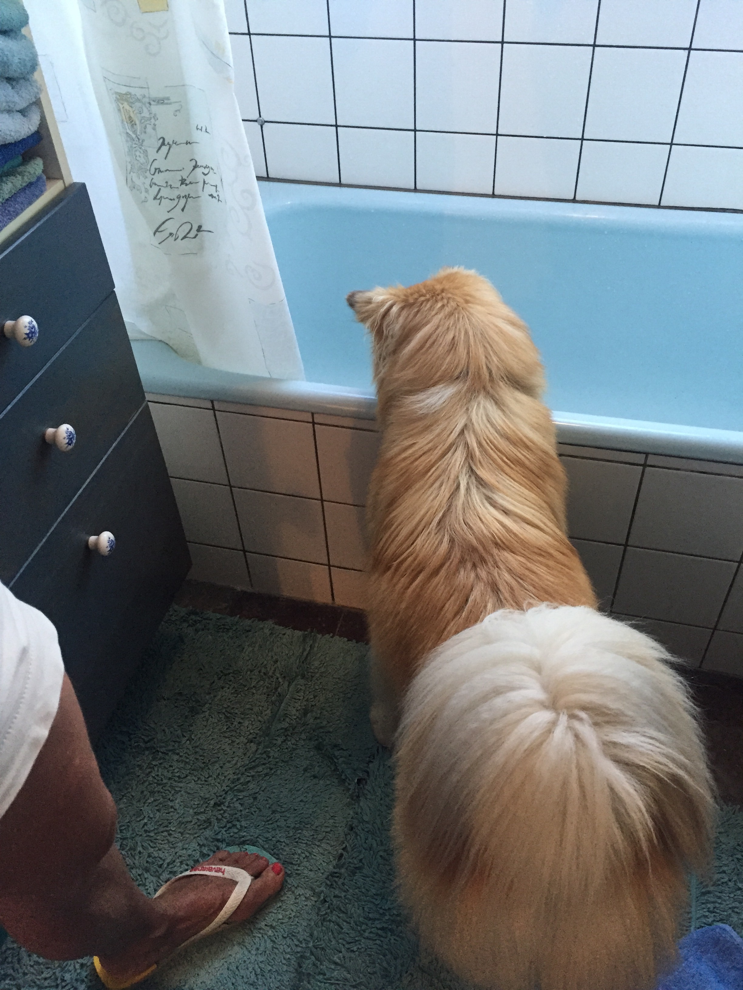 Her kigger Balder på en edderkop i badekaret. Dagens højdepunkt…