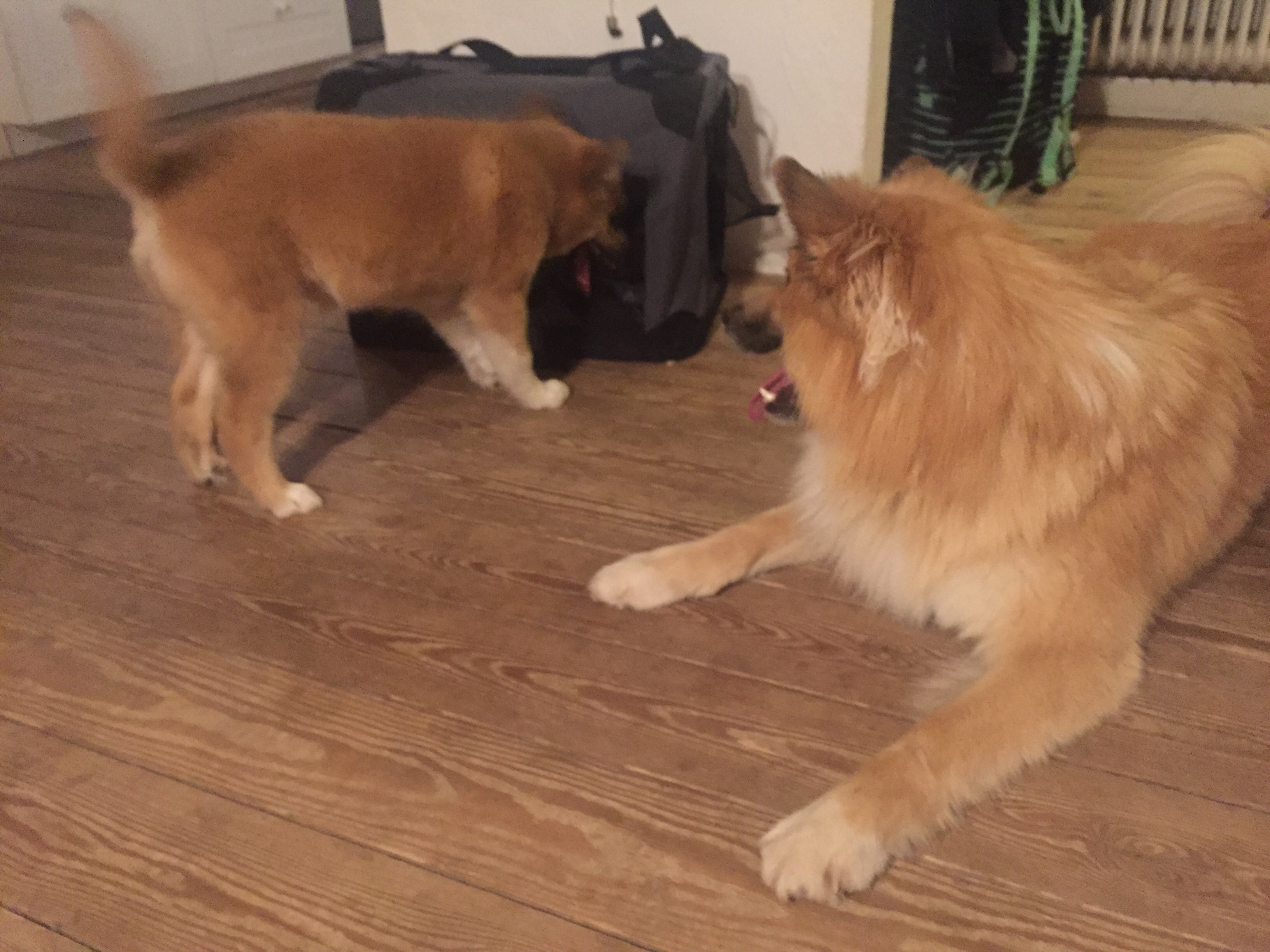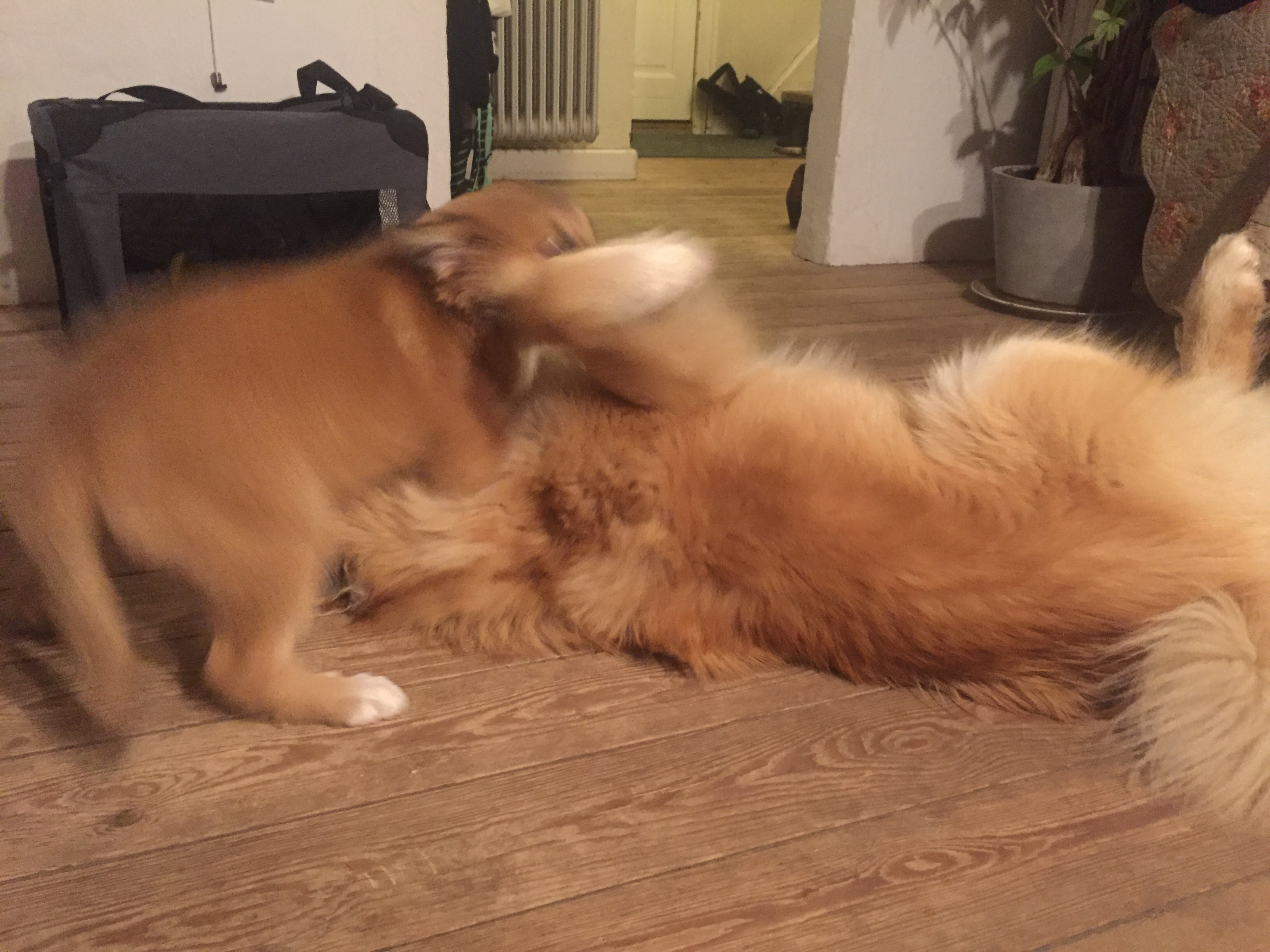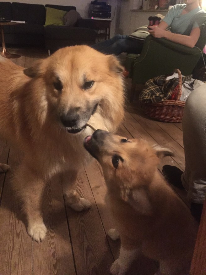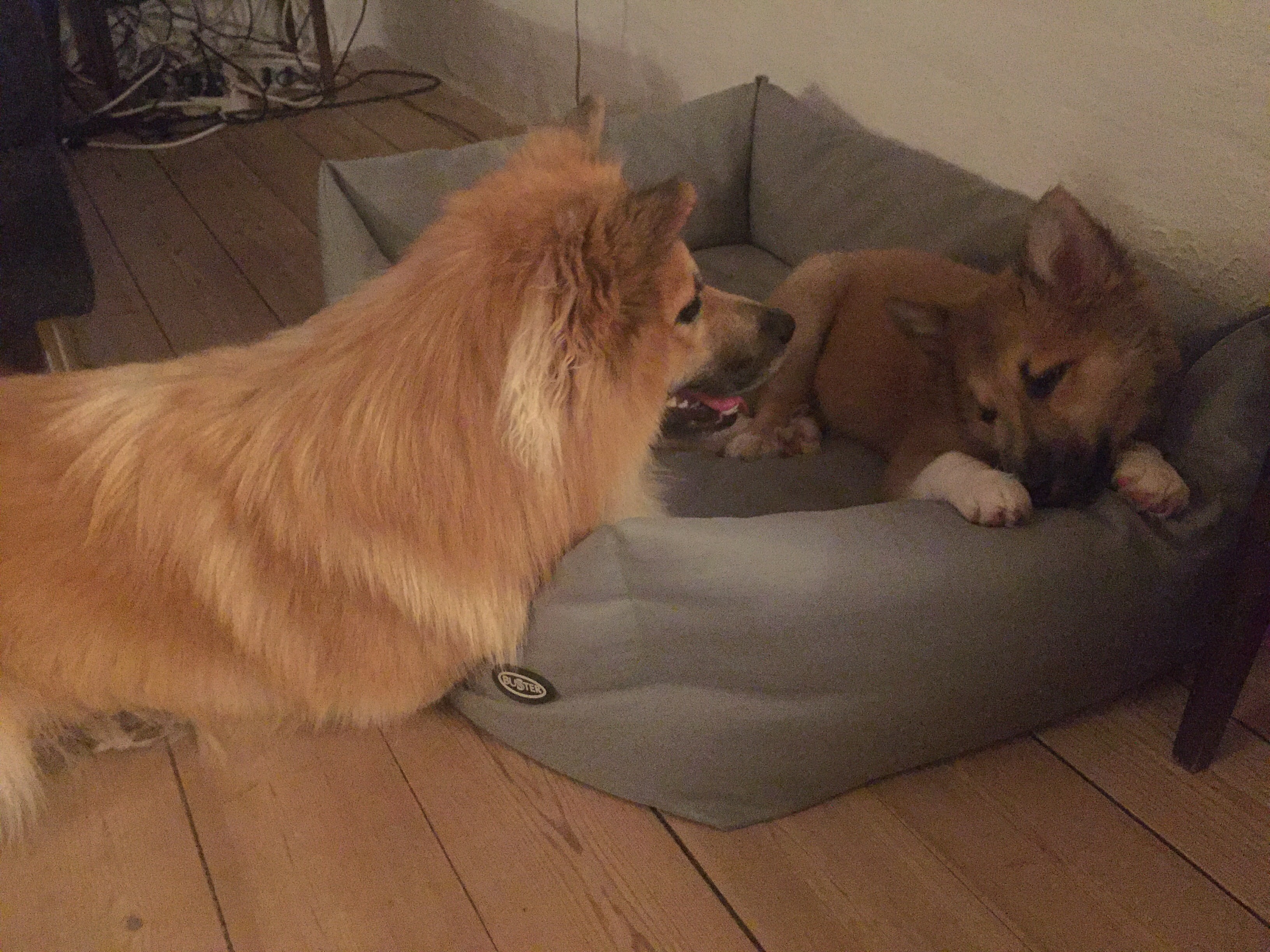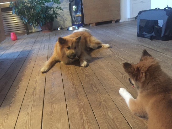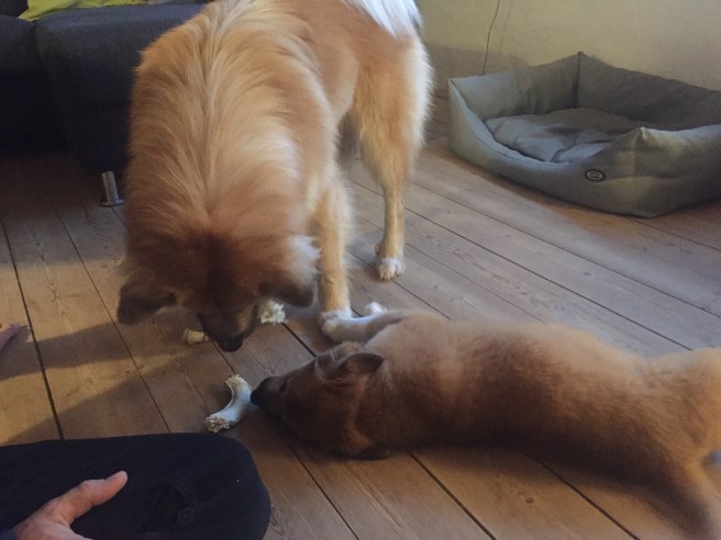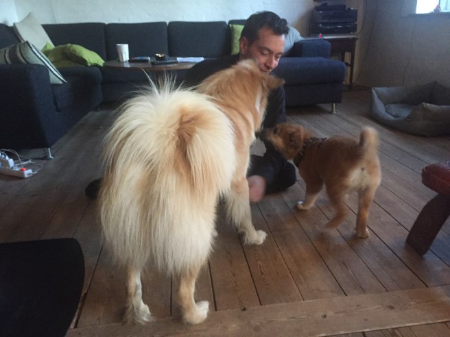 Først brummede han da Smilla ville snuppe hans ben men lynhurtigt fandt de en facon der virkede for den begge. Smilla udfordrede og afprøvede og blev ved og han fandt sig i det!
