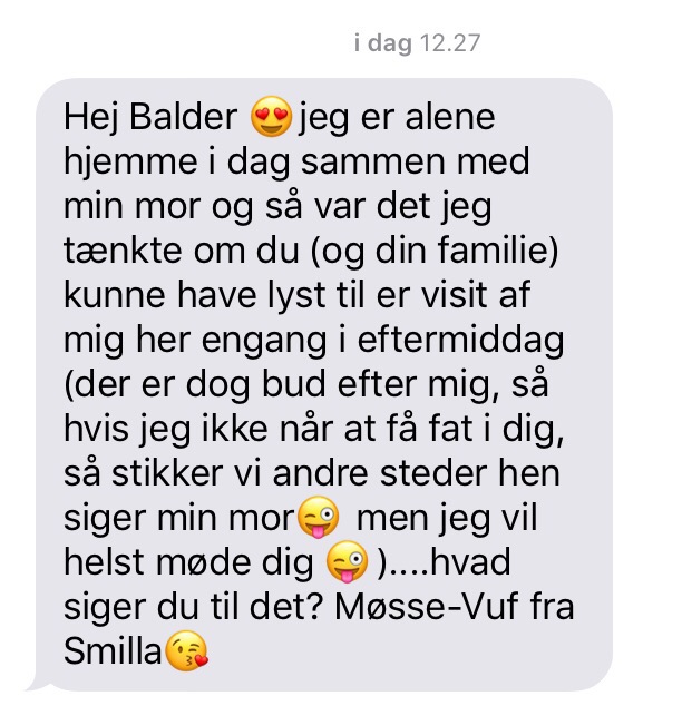 Masser af skæld ud til Balder for selv om jeg godt forstod hans bevæggrund, skal han ikke stikke hjem. Det har han aldrig gjort før. Han er aldrig smuttet…