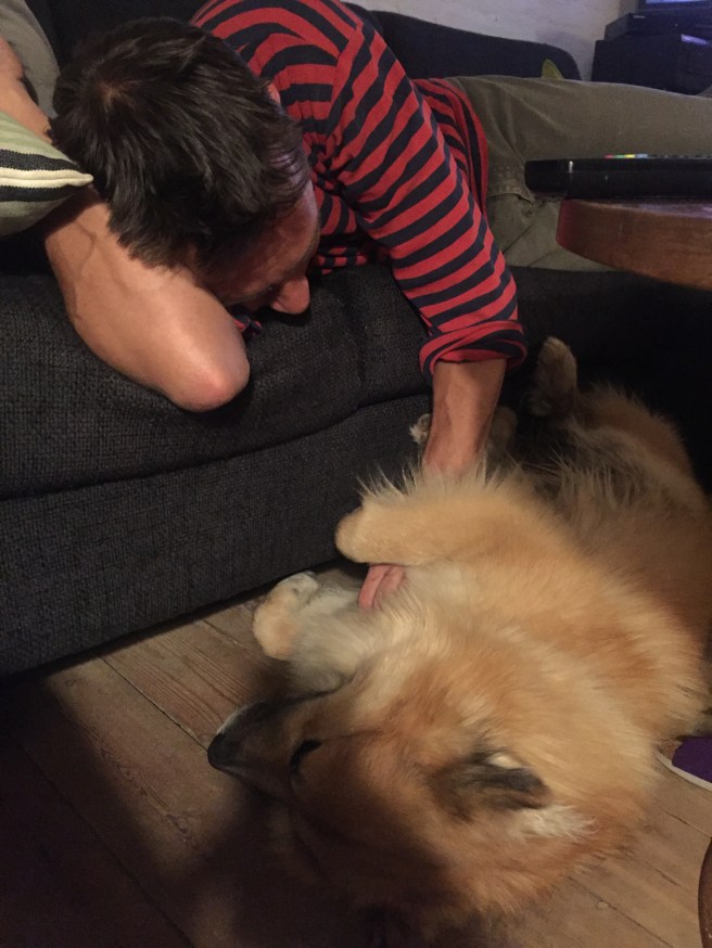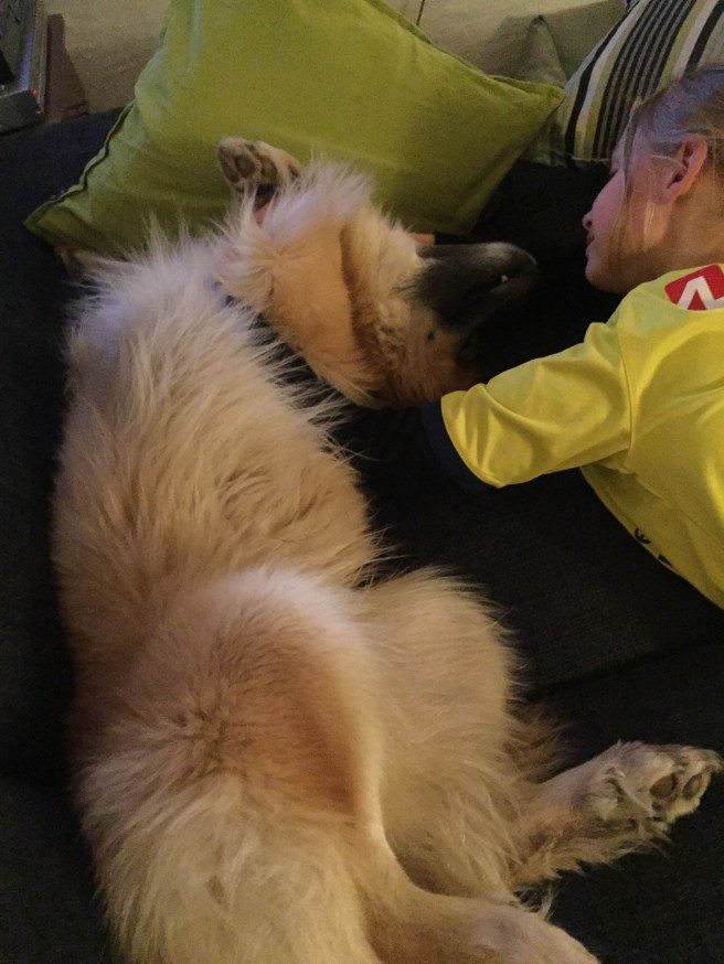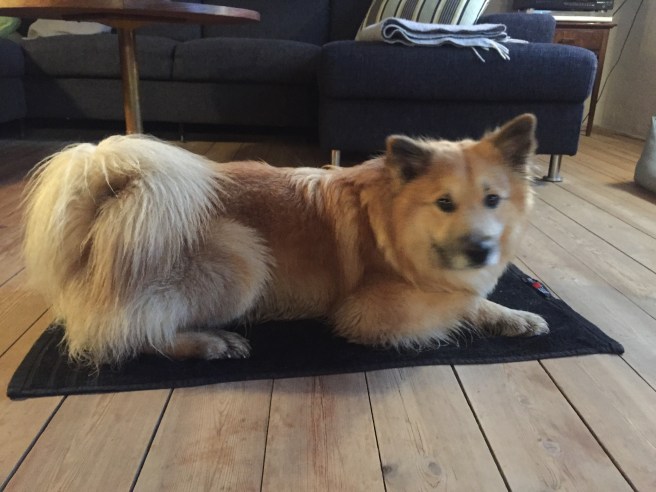 Så kunne man tro han var træt… næ nej! Der er masser af krudt til at drille pigerne på trampolinen, rulle sig oven på sin frisbee. Igen og igen … og søge efter maden gaven uden de irriterende krager derhjemme i Glostrup som han skal holde væk fra sin mad.